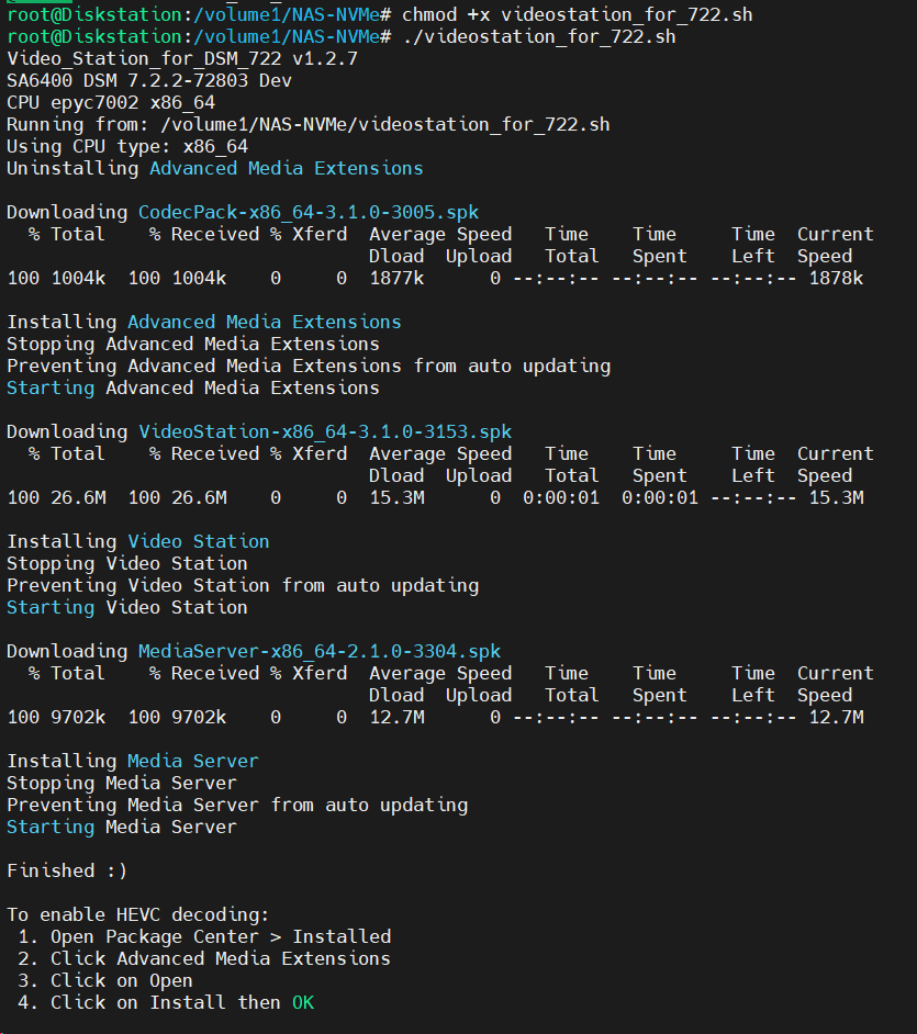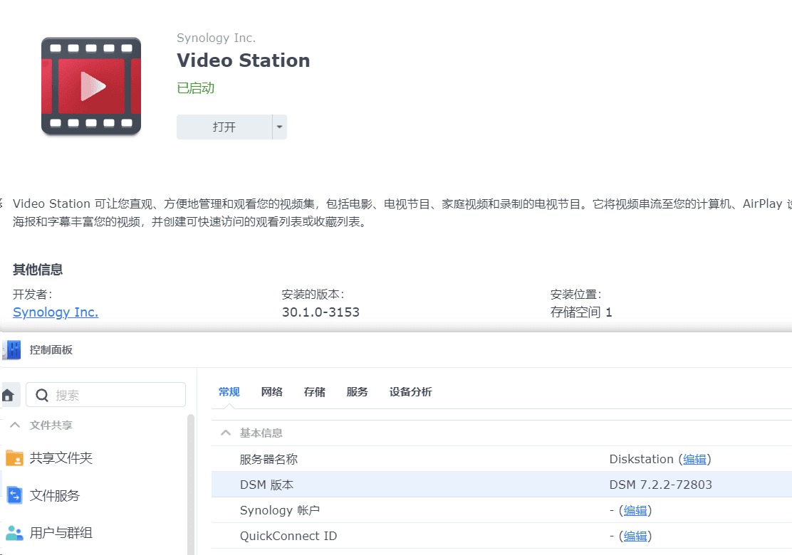 下载Github上007revad/Video_Station_for_DSM_722 本,上传至NAS中赋予执行权限运行: